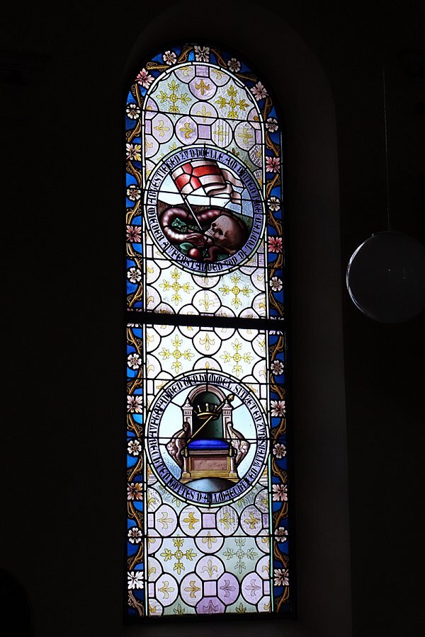 Warth, Pfarrkirche Hl. Sebastian, Glaubensbekenntnis, Erbsünde -Schlange, Apfel, Totenschädel; Richterstuhl und Machtinsignien, 1895, Tiroler Glasmalerei