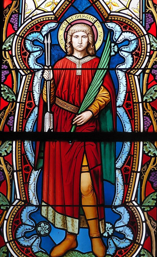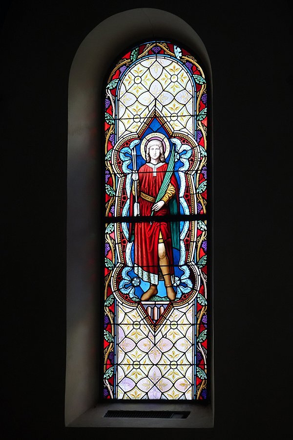 Warth, Pfarrkirche Hl. Sebastian, Chorfenster: St. Sebastianus mit Pfeilen und Palmzweig als Zeichen seines Martyriums, 1895, Tiroler Glasmalerei