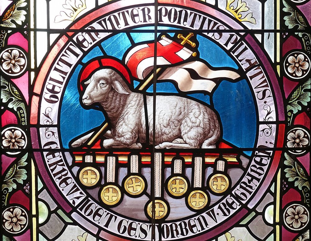 Warth, Pfarrkirche Hl. Sebastian, Lamm Gottes auf Buch mit sieben Siegeln, Schriftband: Gelitten unter Pontius Pilatus. Gekreuzigt Gestorben u Begraben, 1895, Tiroler Glasmalerei