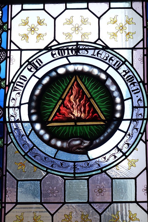 Warth, Pfarrkirche Hl. Sebastian, Flamme in Dreieck umgeben von einer sich in den Schwanz beißenden Schlange als Ewigkeitsymbol Uroboros, Schrift: Und ein ewiges Leben Amen, 1895, Tiroler Glasmalerei