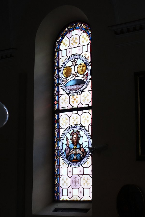 Warth, Pfarrkirche Hl. Sebastian, Glaubensbekenntnis, Sonne, Mond und Sterne, Gott mit Segnungsgeste Heiliger Geist als Taube, Schrift: Und an Jesus Christus seinen eingeborenen Sohn unseren Herrn, 1895, Tiroler Glasmalerei