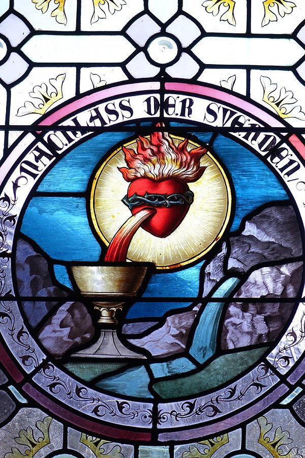 Warth, Pfarrkirche Hl. Sebastian, Herz mit Dornenkrone, Blutstrahl in Kelch, Wasser springt aus dem Felsen, Symbol für das Blut Christi als Quell des ewigen Lebens, Schrift: Nachlass der Sünden, 1895, Tiroler Glasmalerei