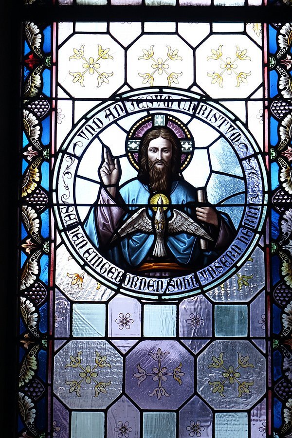 Warth, Pfarrkirche Hl. Sebastian, Gott mit Segnungsgeste, Heiliger Geist als Taube, Schrift: Und an Jesus Christus seinen eingeborenen Sohn unseren Herrn, 1895, Tiroler Glasmalerei
