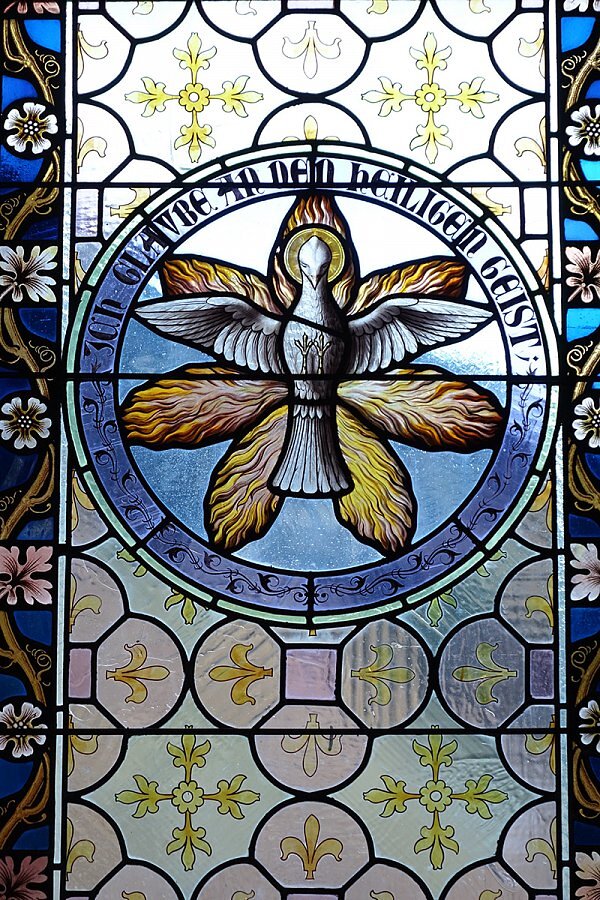 Warth, Pfarrkirche Hl. Sebastian, Taube als Symbol für den Heiligen Geist, Schrift: Ich glaube an den Heiligen Geist, 1895, Tiroler Glasmalerei