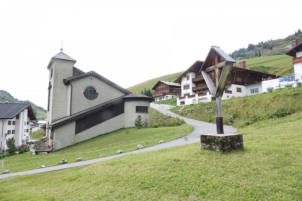 Dieses Kleinod der Moderne des Kirchenbaues in Vorarlberg mit den frühesten Glasfenstern von Martin Häusle liegt versteckt hinter den Hotels im Nobelskiort Zürs. Es ist mehr als wert entdeckt zu werden im Sommer bei einer Wanderung oder im Winter als willkommene Erholung vor dem Rummel des Apres Ski Getöse.