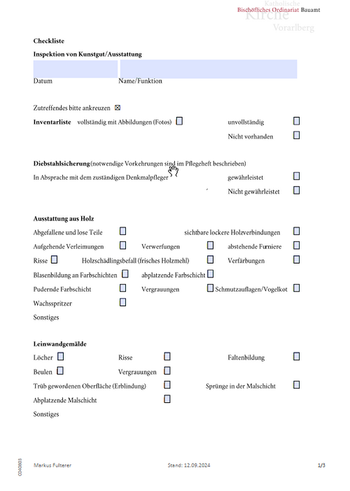 Die folgenden Blätter sind als Hilfestellung gedacht. Sie können für regelmäßige Wartungs- und Kontrollgänge als Checklisten herangezogen werden, um einerseits eine einfache, rasche Dokumentation vorzunehmen, andererseits aber auch den Blick auf Vollständigkeit zu üben. Die meisten Pfarrkirchenräte, Mesner usw., die mit ihren Kirchen und Gebäuden bestens vertraut sind, machen dies ohnehin routinemäßig bzw. haben den entsprechenden Blick dafür. V.a. für neue Pfarrkirchenräte sind diese als Instrument und Hilfestellung gedacht.